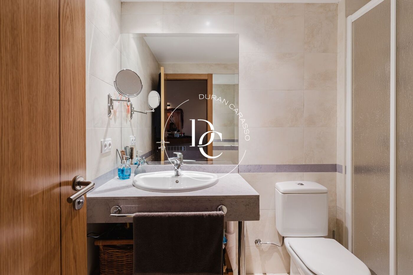 Un baño completo con plato de ducha, moderno y funcional.