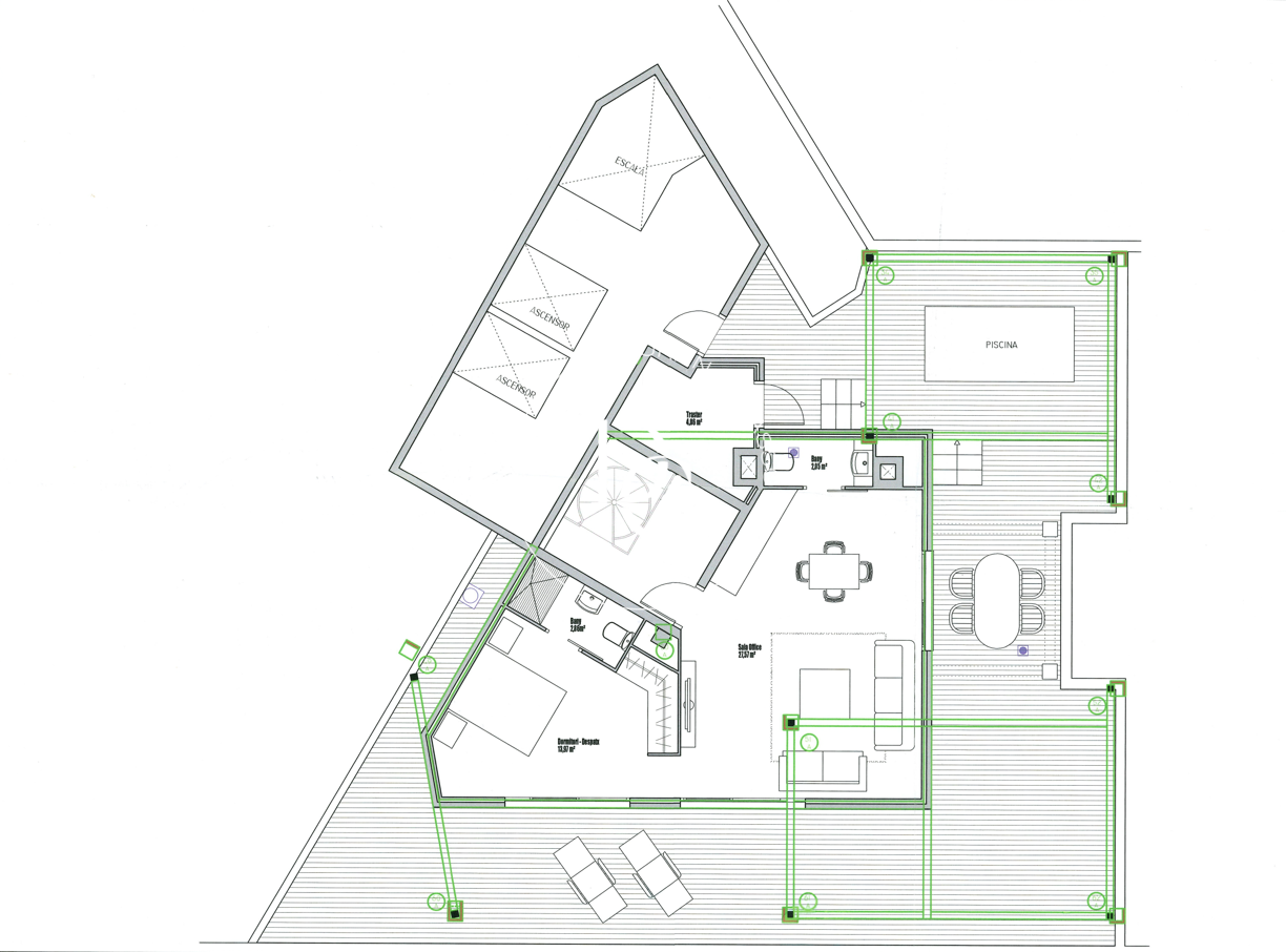 La planta superior, de 230 m², està concebuda com un espai per a l’oci i la relaxació. Disposa d’una gran sala polivalent, un lavabo de cortesia i una àmplia suite amb bany complet. Des d’aquí s’accedeix a una terrassa de 155 m² orientada al sud, amb piscina privada, zona chill-out i menjador exterior, ideal per gaudir del sol i de les vistes durant tot l’any.