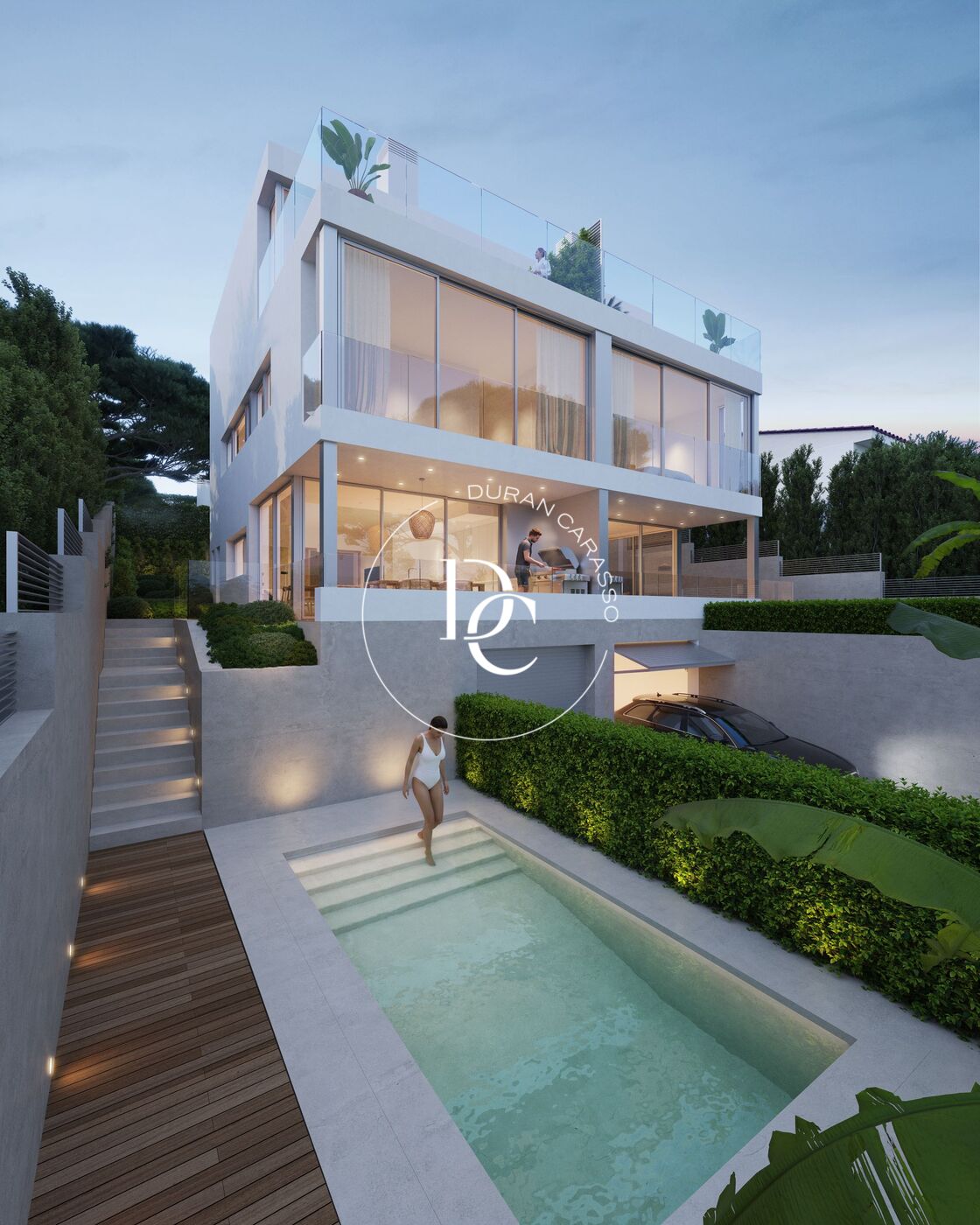 D'una banda, la villa principal compta amb 6 dormitoris distribuïts en 3 plantes. En primer lloc, trobem la planta baixa, on des de l'espectacular entrada de la villa accedim a un gran saló molt espaiós, que compta amb una sala de benvinguda separada. El sòl de marbre polit ens condueix per tot l'interior fins a trobar les àmplies i luxoses àrees d'estar d'impecable disseny de planta oberta, que aporta lluminositat a les estances fent que les vistes al mar tinguin gran part del protagonisme.