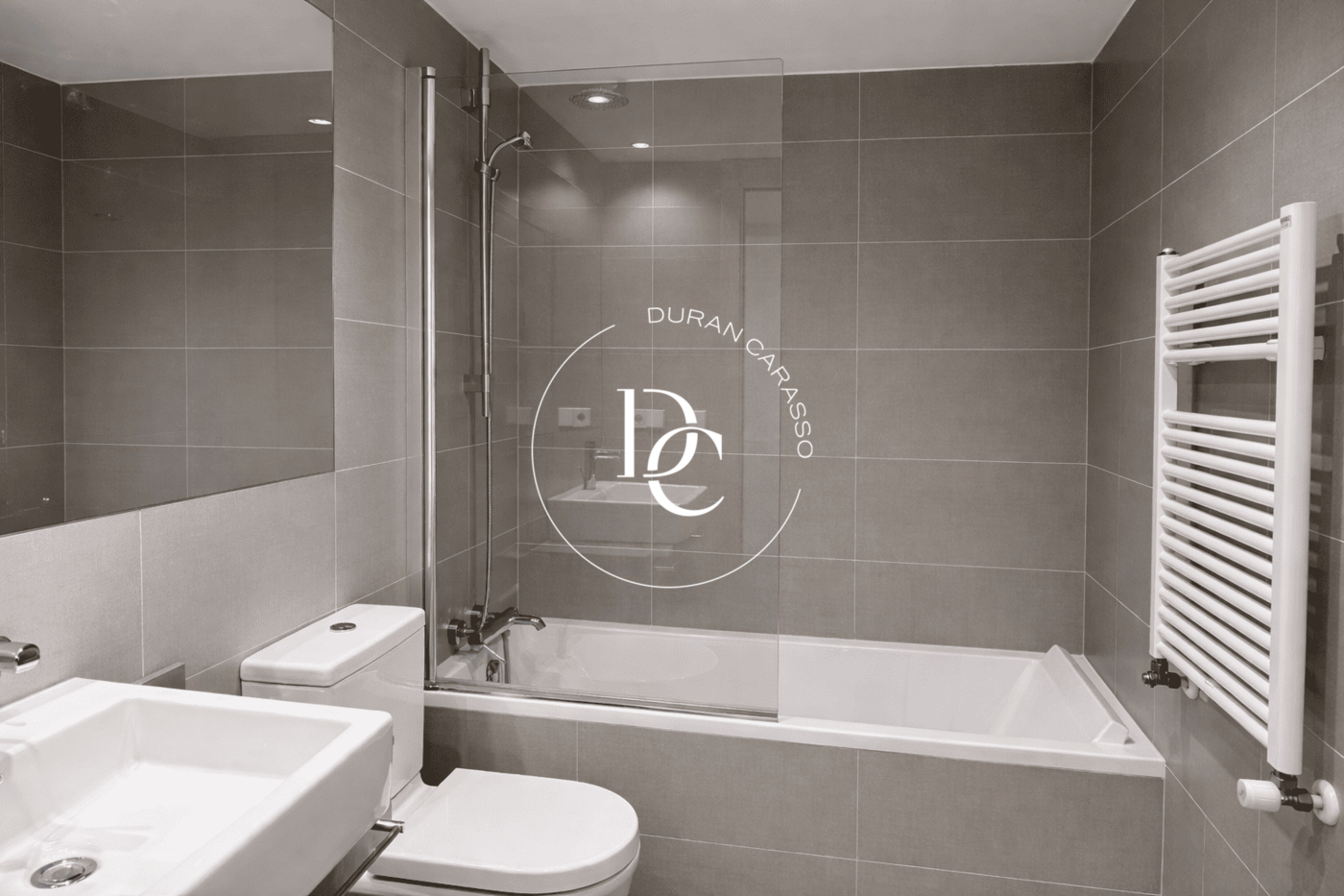 It features two double bedrooms, one of them an en-suite with dressing room and a full bathroom with shower, as well as a second full bathroom with bathtub.