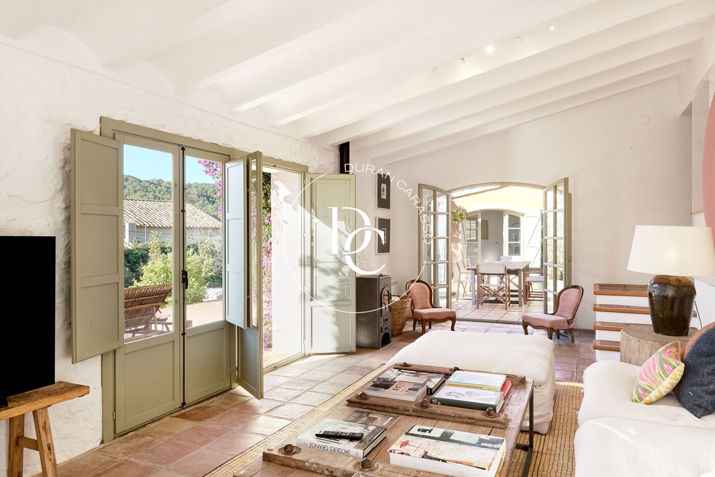 The property, spanning over 3,400 m², has been elegantly renovated, respecting the architectural style of Catalan masías while blending modern design with luxury.