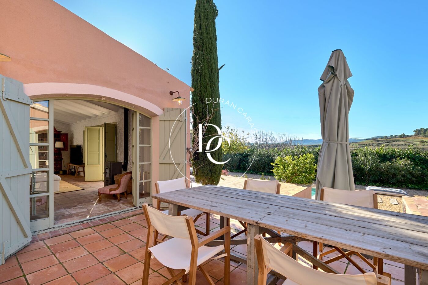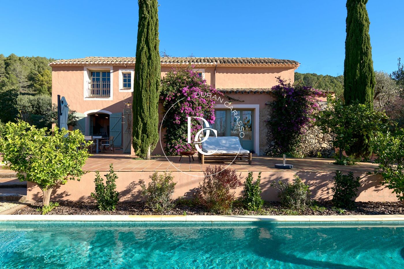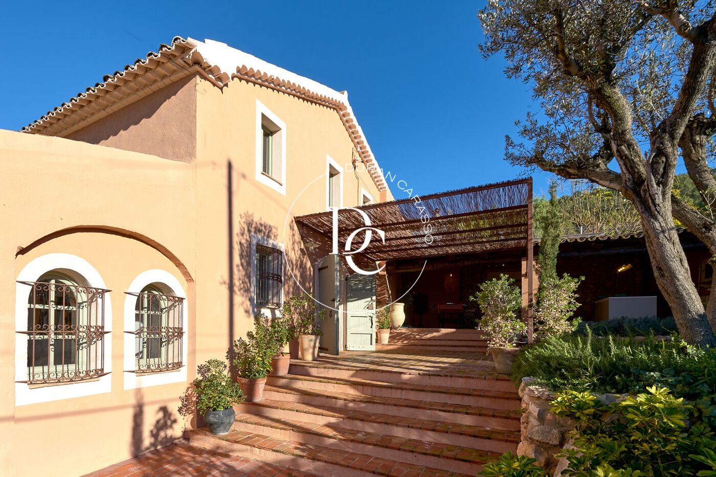 Upon entering the property, we are greeted by the main house, which seamlessly combines Mediterranean style with Provençal-inspired colors, alongside meticulously maintained outdoor spaces.