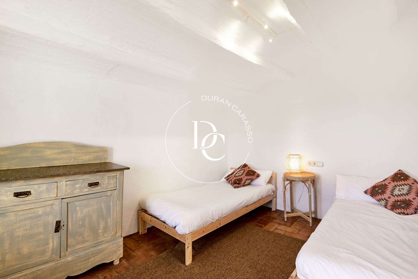 Inside the house, a welcoming hall with a fireplace and wooden beams—typical of traditional Catalan architecture—sets the tone. Adjacent to this space, there is a bedroom with views of the outdoor terrace.
