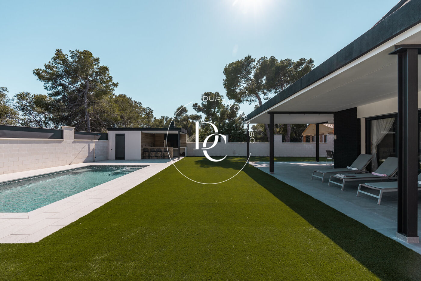 Le jardin est un point fort de la propriété, entourant toute la maison. Il comprend une piscine de 8x4 mètres avec distributeur automatique de pH et élimination des bactéries par rayons UV. Une aire de jeux avec un demi terrain de basket, un point feu au sol, et un espace barbecue avec une péninsule de 2,40 mètres de long, un évier de 70 cm de large, une salle de bain et un local pour le purificateur.