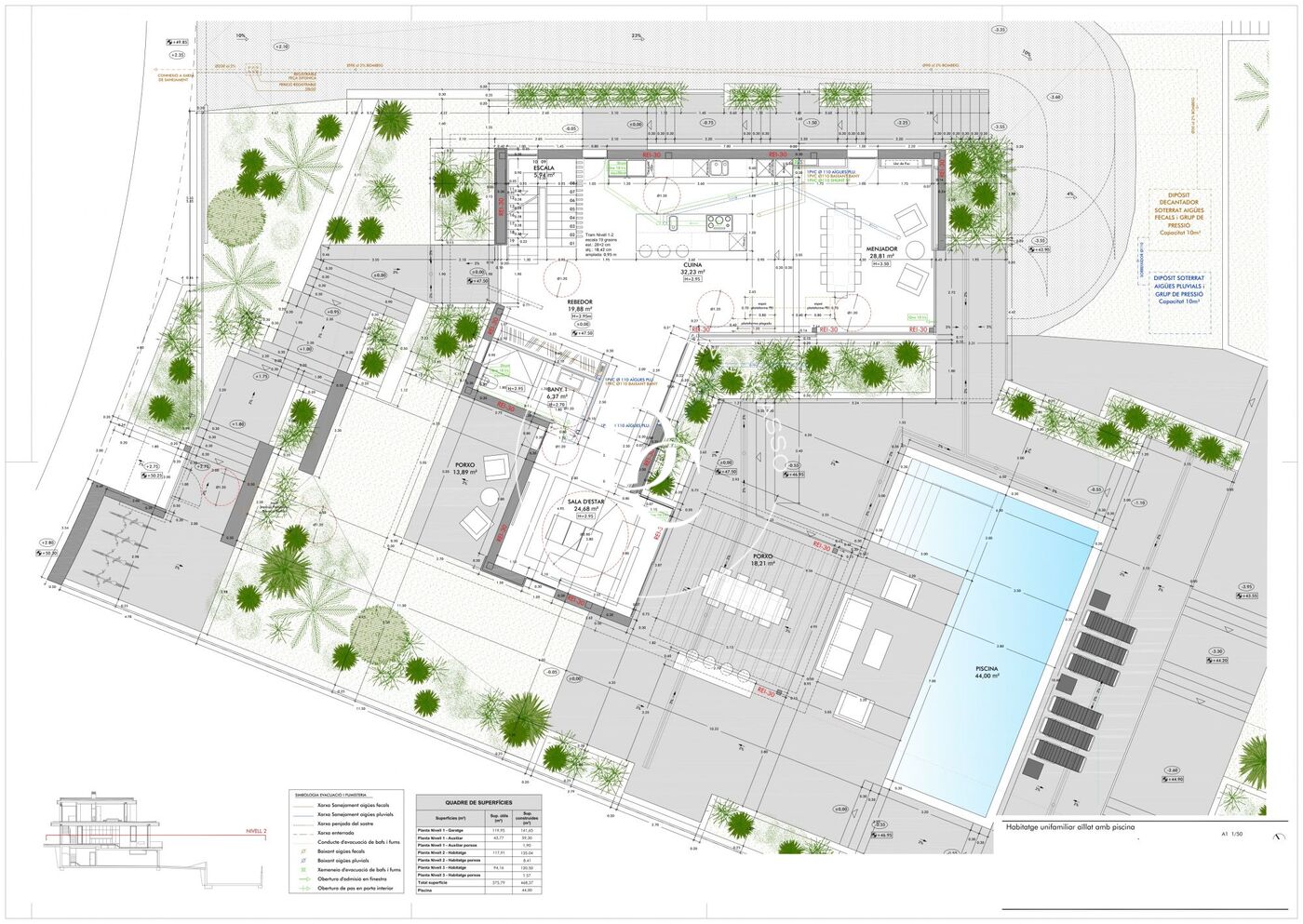 Al entrar, nos da la bienvenida un gran jardín con piscina privada, porche cubierto y espacios diseñados para disfrutar del fantástico clima del Garraf. Este jardín es, sin duda, la joya de la propiedad, no solo por su extensión, sino también por las posibilidades de